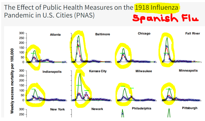This was EXACTLY the same as what occurred with the Spanish Flu in the USA in 1918. Initially there were the Peaks, then it all tailed off as NATURAL IMMUNITY among the UN-VACCINATED took its natural course ------>
