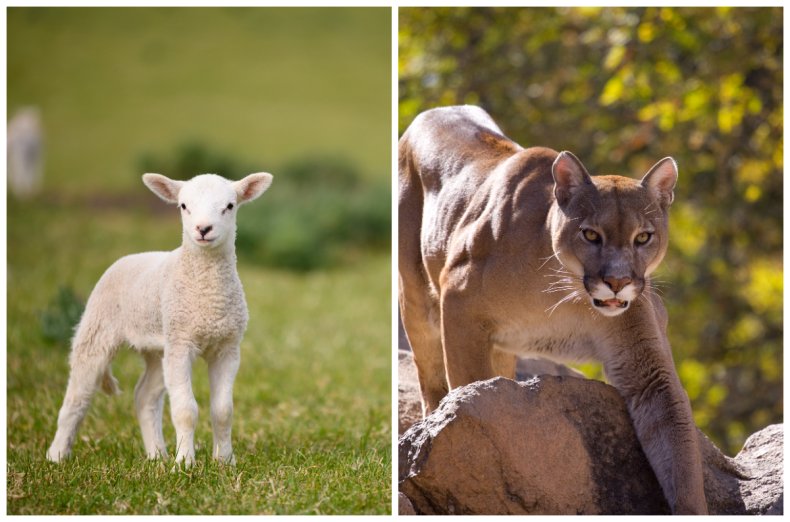 A picture shows a lamb and a mountain lion side by side. A farmer living in Lower Lake, in Lake County, noticed the dead lambs last week and notified the California Department of Fish and Wildlife.SANDMANXX / GARETH WEBB Mountain lions, also known as pumas or cougars, interact with hundreds of species and play a direct role in balancing various habitats across the state and other parts of the U.S. They are considered important in maintaining ecosystems and controlling other animal populations such as deer, its preferred prey.