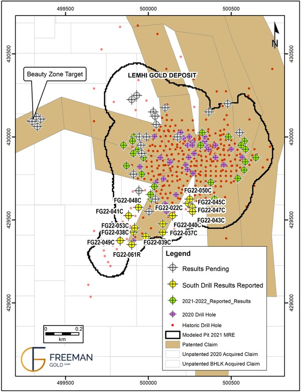 Freeman Gold Corp. Jan 17, 2023, 07:30 ET Expansion and infill drilling successfully extends known mineralization at Lemhi 350 metres south and southwest of previous drilling by FreemanPhase 2 diamond drill holes continue to intersect shallow oxide gold mineralization within existing resource pit boundaries both along strike and at depth FG22-022C returned 5.95 g/t Au over 9.14mFG22-061R returned 2.4 g/t Au over 13.72m FG22-050C returned 1.22 g/t Au over 38.59m, including 2.73 g/t Au over 10mFG22-048C returned 0.98 g/t Au over 17m, including 2.1 g/t Au over 5m