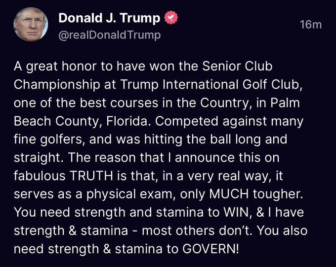 Trump remains undefeated in golf tournaments that he runs on his courses, which proves his “strength and stamina.”