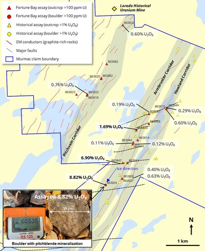 Prospecting Program Summary & Objectives: Carried out in September and October 2022 to validate historical results and assist in the development and prioritization of future drill targets.Provided follow-up to the 2022 maiden drilling program at Murmac, which intersected anomalous uranium in multiple drill holes (see News Releases dated August 23, 2022 and December 13, 2022).Comprised surface prospecting, structural mapping and rock geochemical sampling, focused along prospective trends identified by the 2022 drilling program and areas with encouraging historical uranium results.Results from the field program have been integrated with the 2022 drilling results to define priority targets for drill testing. Summary of Prospecting Program Results: Numerous historical uranium occurrences of interest were reliably located and validated (see Table 1 and Figure 2). These occurrences comprise narrow fault-hosted mineralization and are consistently associated with large faults that cross-cut the local stratigraphy. The intersections of these cross-cutting faults with conductors provide compelling structural target locations for drill testing. Graphite-rich rocks, or "conductors", are the favorable host rock for the targeted high-grade deposits but do not outcrop on surface due to their softer nature, lying within valleys and being covered by soils, glacial sediment and shallow lakes. Historical exploration did not focus on these conductors as targets.Additional outcrop sampling (149 samples) along conductor valley edges highlighted encouraging enrichments of "pathfinder" elements that are typically associated with high-grade, basement-hosted deposits in the Athabasca Basin, often spatially associated with cross-cutting faults. These pathfinder enrichments are consistent with those noted in graphitic drill core with elevated uranium content from the Fortune Bay 2022 drill program.Historical records include mineralized and radioactive boulders located in valley floors, with up to 1.25% U3O8 reported. An example of one of these boulders was discovered by Fortune Bay located in thin till cover at the edge of a conductor valley on the Armbruster Corridor (see Figure 2, Table 1 sample 863924). The boulder was located approximately 100 metres from a radioactive spring (historical occurrence) with surface radioactivity of 15,000 counts per second ("cps"). The boulder, approximately 15 cm in diameter mineralized, produced "off-scale" radioactivity (65,535 cps) on a Super-SPEC RS-125 handheld spectrometer and assayed at 8.82% U3O8. The boulder is interpreted to originate from within the Project area, given the southwest ice direction and Martin Group cover rocks in the north of the Project. The occurrence provides compelling support for the presence of high-grade, basement-hosted uranium mineralization and follow-up efforts are planned to be directed up-ice of the occurrence.The validated historical results, together with pathfinder element results and the extensive structural mapping carried out during prospecting, will be used to support the prioritization of drill targets. Figure 1: Location of Fortune Bay's Murmac, Strike and Goldfields Projects. Table 1: Prospecting rock sample results with >100 ppm U. Sample
