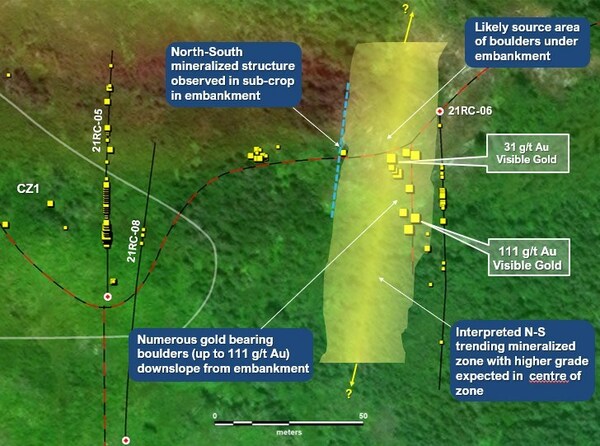 The highest grade sample, which assayed 31 g/t Au, was collected from the eastern end of the Conquest Zone and contained visible gold (see Company News Release dated December 13, 2022). This is the third occurrence of visible gold in the Conquest Zone. Four other samples collected nearby during the same program assayed 0.24, 0.9, 2.5 and 5.7 g/t Au. All but one of these samples are from large angular boulders. Approximately 20 metres west of the high-grade sample, a less intensely altered version of the same rock containing the visible gold was observed in a north-south trending sub-crop along a road cut which assayed 0.24 g/t Au. Drill-hole 21RC-06 from the 2021 drilling program is located 30 metres east of the sub-crop and was drilled parallel to these newly identified north-south trending mineralized structures. The sub-crop and drill-hole 21RC-06 are now believed to represent the western and eastern edge of a north-south trending mineralized structure (See Figure 1). Planned trenching will expose the area between these two points with the objective of locating the source of the two visible gold boulders found nearby.