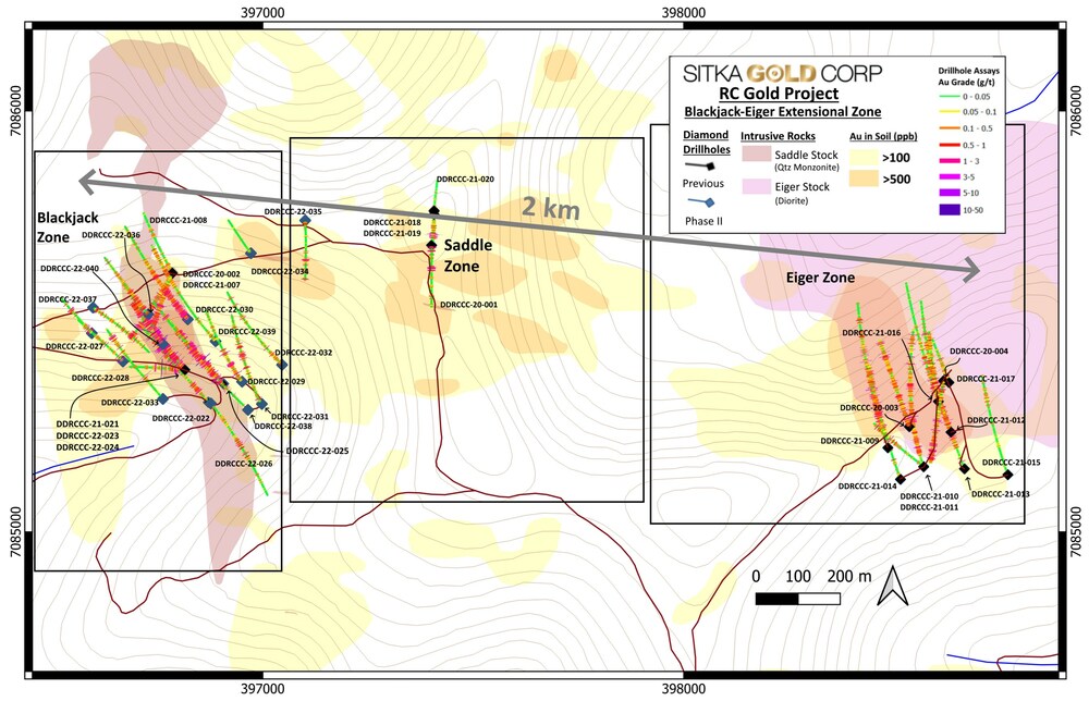 "The production of an initial resource of over 1.3 million ounces of gold with only 34 diamond drill holes marks a major milestone for our flagship project in the Yukon," stated Cor Coe, Director and CEO of Sitka. "Beginning in 2020 with the initial four diamond drill holes that Sitka drilled in the Blackjack-Saddle-Eiger corridor, our team knew we had discovered an area with high potential to produce a discovery of an intrusion related gold deposit. To advance the project in such a short time and produce an initial resource estimate for the Blackjack and Eiger zones is a testament to this potential and the abilities of Sitka's technical and operational teams. With both the Blackjack and Eiger deposits open in all directions, this initial Mineral Resource provides a solid foundation from which we can build upon to add additional resources and unlock further value from our RC Gold Project. The Company is currently planning a two part, winter and summer diamond drilling program totalling 10,000 metres at RC Gold for 2023, focused primarily in the Blackjack, Saddle and Eiger zone areas."