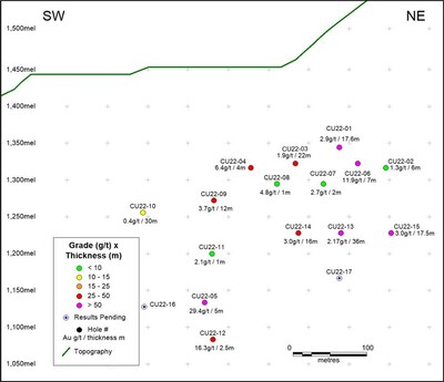CU22-12 – 2.5 metres grading 18.54 g/t Au EqCU22-13 – 36.0 metres grading 2.29 g/t Au EqCU22-14 – 4.0 metres grading 19.35 g/t Au Eq; including 2.0 metres grading 36.59 g/t Au EqCU22-15 – 17.5 metres grading 3.07 g/t Au Eq