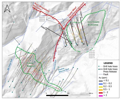 VANCOUVER, BC, Jan. 24, 2023 /CNW/ - Luminex Resources Corp. (TSXV: LR) (OTCQX: LUMIF) (the "Company" or "Luminex") is pleased to announce drill results from six holes (CU22-10 to CU22-15) at Cuyes West. Drilling has confirmed a strike length of approximately 350 metres, while the anomaly has been mapped at surface for more than 500 metres. The drilled vertical extent of the Cuyes West mineralized structure now exceeds 300 metres. All holes have now been reported from the 2022 program, except for CU22-16 and CU22-17 (completed in January). Drilling at Cuyes West is continuing with one rig; a second rig is on standby to drill Prometedor as soon as trail and pad construction are complete. Drilling of Prometedor is expected to start by March.