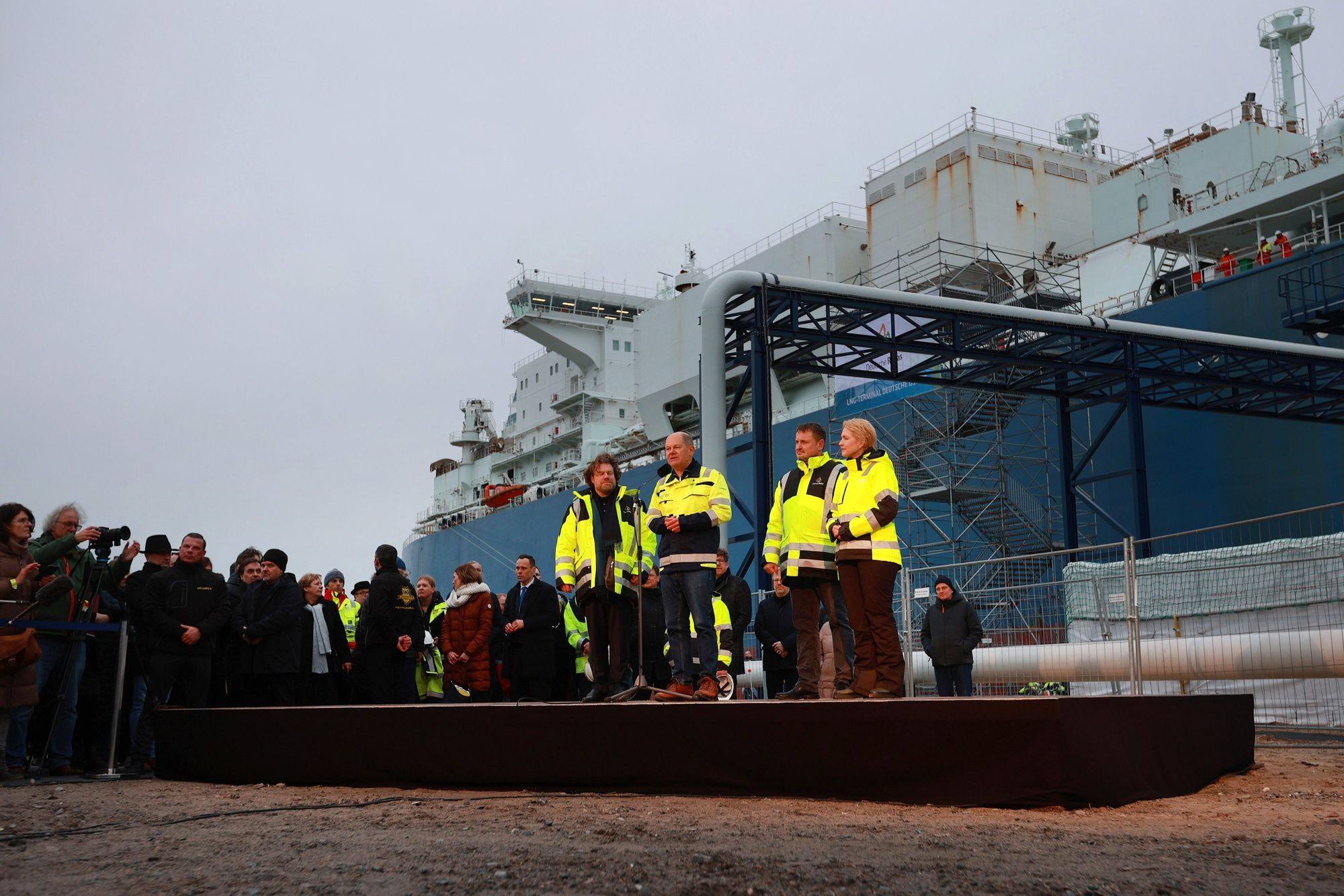 German Chancellor Olaf Scholz (second left on the stage) speaks in front of the Neptune LNG floating storage regasification unit during the inauguration of the German Baltic Sea LNG Terminal in Lubmin, Germany, on January 14. Energy security will continue to be a top priority for policymakers. Photo: Bloomberg