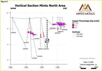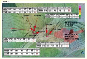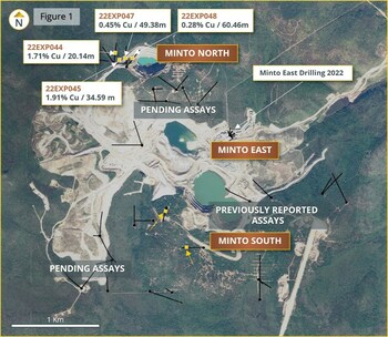 0.28% Cu over 60.46 m including 1.40% Cu over 1.99 m from 199.03 m downhole.David Benson, Vice-President Exploration commented, "We are pleased and encouraged by the results from follow-up, step-out drilling at Minto North. This drilling has confirmed the existence of a consistent, robust mineralized system west of the historical Minto North Pit. These results give us full confidence to proceed with further delineation drilling at Minto North and the expectation to increase the Company's mineral inventory in 2023."