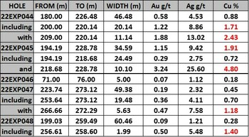 0.45% Cu over 49.38 m including 1.18% Cu over 5.63 m from 223.74 m downhole; and Hole 22EXP048