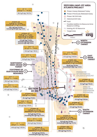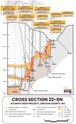 Holes released today tie into 2021 hole AT21-62, which returned 55m averaging 5.34 g/t Au starting at 9.1m depth on the east end of Section22-8N. These holes continue to encounter high-grade gold and silver mineralization, hosted in oxide material, tracking it to the west across the AMFZ where it remains open both to the west and to depth.Core holes AT22HG-1T and AT22HG-2T bottomed in Au-Ag mineralization at depths of 293m and 265m, respectively.Holes AT22NS-20 (33.5m of 3.43 g/t Au and 125.7 g/t Ag) and AT22NS-53 (67.1m of 2.88 g/t Au and 52 g/t Ag) penetrated the silica breccia zone directly above a fine-grained dacite porphyry dike that was also encountered south of this section along the western boundary of the West Atlanta Fault on Section22-6N ( released January 6, 2023). Hole intercepts above and adjacent to this intrusive unit tend to host higher Au-Ag grades, and the volcanic section west of the intrusion is mineralized, unlike areas east of the intrusion.Mineralization in hole AT22NS-71 (51.8m @ 2.95 g/t Au and 79.5 g/t Ag) is hosted within silicified breccia that is sandwiched on top and bottom between mineralized porphyritic quartz latite tuff dike breccia bodies. Beneath the mineralized zone, AT22NS-71 cut down through barren dolomite, then through anomalous tuff dike breccia, and finally through the Atlanta King Fault ("AKF") and into quartzite. This lithotype sequence strongly suggests the AKF is serving as a conduit for channeling felsic dikes and dike breccia bodies into the silica breccia horizon. Higher Au-Ag grades are frequently found in the silica breccia proximal to these tuff dikes further south along the AKF. The Company is utilizing this close spatial relationship between these dikes and Au-Ag mineralization as an important exploration guide for finding higher grades as it advances the drills northward along the AMFZ.Cal Herron, Exploration Manager of Nevada King, stated, "Section 22-8N is important for revealing two distinct zones of higher grade Au-Ag mineralization along the AMFZ – one coinciding with narrow fault blocks developed along the West Atlanta Fault, and the other occurring within narrow fault-bounded blocks formed in between the Atlanta King and East Atlanta Faults. This is most evident in the 13m-wide fault block drilled by historical holes 88-9, 88-14, AC-1 and KR97-6. The clustering of high-grade hits reported in these four holes (see Table 3) is highly unusual at Atlanta, but this is in part due to the unusually high hole density along this section. With this fault block so well defined, Nevada King is now in good position to track the high-grade structure along strike to the north and south. Similarly, the 30m wide fault block zone between the Atlanta King and East Atlanta Faults is becoming better defined and we are now able to track it along strike as well. This level of definition was not provided by historical drilling, and these new results will aid in accurate modeling of these high-grade zones.
