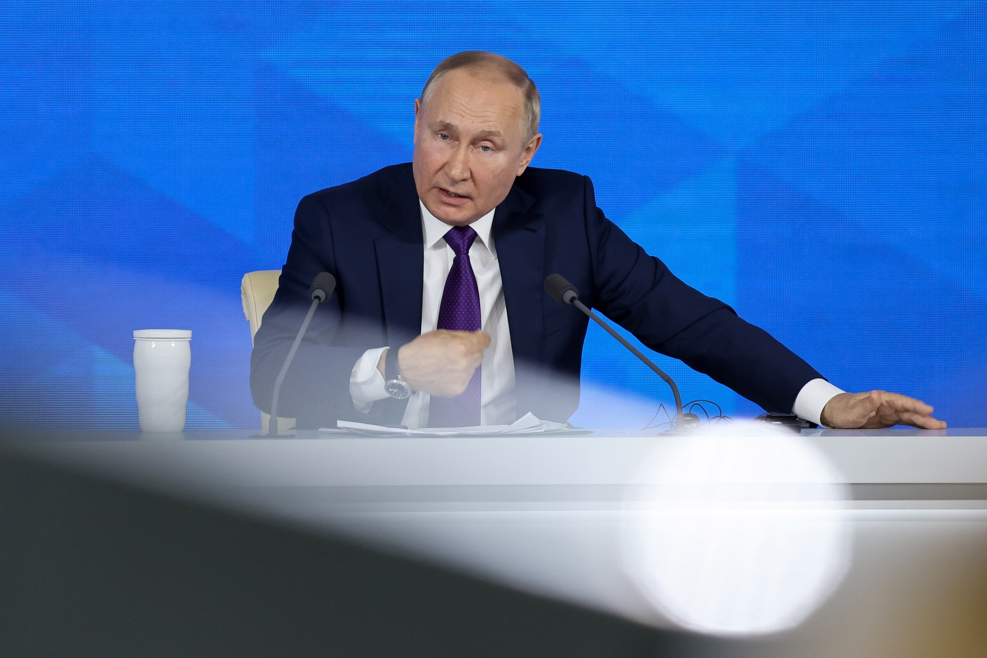 Vladimir Putin delivers his annual news conference in Moscow on Dec. 23, 2021.