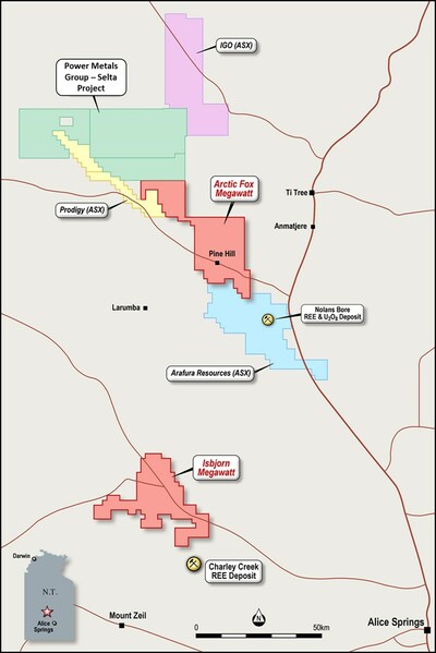 The Arctic Fox Project is located circa 185 km by road north-west of Alice Springs in the Northern Territory (refer Figure 2). More significantly, it is 35 km north-west of Arafura Resources (ASX: ARU) world-class Nolan's Bore REE deposit which contains a Total Mineral Resource Estimate (MRE) of 56Mt at an average grade of 2.6% TREO and 11% phosphate (P2O5) that extends to 215 m below surface. In addition, the MRE has an estimated 26.4% Nd Pr enrichment1.