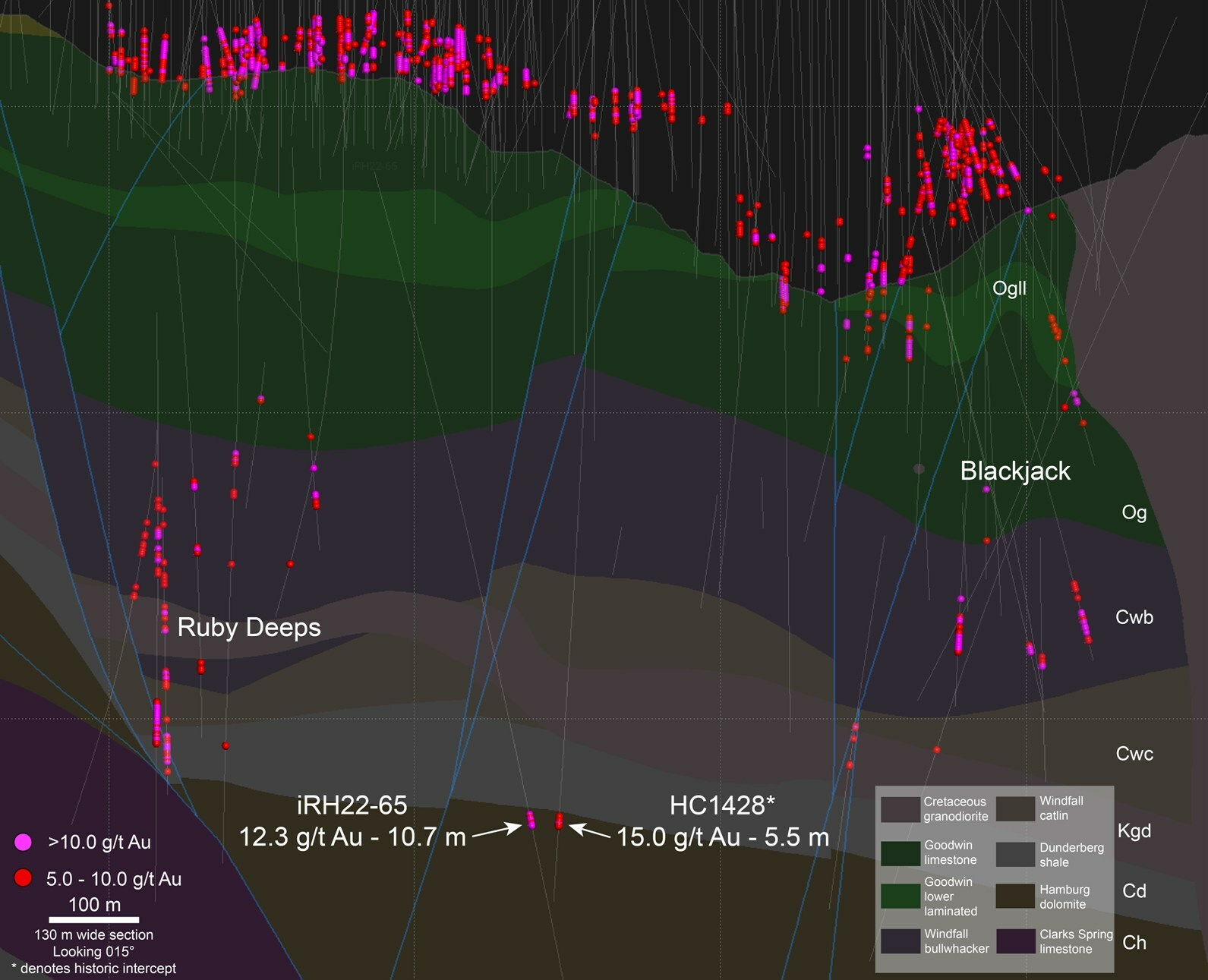 “Our multiple discoveries made in 2022 highlight the potential of the mineralized system at Ruby Hill and confirm our model for the occurrence of multiple types of world-class, high-grade, deposits”, stated Tyler Hill, Senior Geologist of i-80. “Drilling is currently focused on expanding mineralization within the Hilltop Zones and the Blackjack horizon, both of which are located in close proximity to the underground infrastructure currently being planned and permitted”.