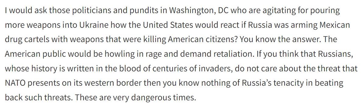 Fourth, it proves that the war is not a struggle for Ukrainian liberation or democracy. That’s hogwash. It is a war that is aimed at “weakening” Russia and eventually removing Putin from power. Those are the overriding goals. What that means is that Ukrainian soldiers are not dying for their country, they are dying for an elitist dream to expand NATO, crush Russia, encircle China, and extend US hegemony for another century. Ukraine is merely the battlefield on which the Great Power struggle is being fought.