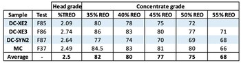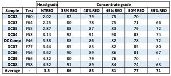 | If the flotation plant is fed DC material mixed with other lithological types, as planned for later in the mine life, recoveries at different target concentrate grades will be as shown in Table 2. Of the four blends tested, when producing a 40% TREO flotation concentrate the recovery rate averaged 80% with higher recoveries when the DC content was higher.