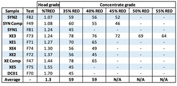 | Table 3 shows the testwork results for the variability samples comprising pure XE and SYN lithologies. The flotation plant is expected to only see such lithologies when they are blended with DC. However, the data show that if the lower grade XE and SYN material are processed alone, at a target flotation concentrate grade of 40% TREO, the average recovery rate will be 59%.Table 3: Recovery rates at concentrates of specified grades - SYN and XE samples