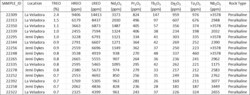 To date, 188 assays from rocks collected at Jemi Dykes and Veladora North have been received while results for 177 samples from Veladora North are pending. Of the 188 samples with assay results, over one third (76 samples) returned values greater than 0.15% total rare earth oxide (TREO1), including 5 samples that returned values greater than 1.0% TREO1 to a maximum value of 2.4% TREO1 (sample number 22309) (Table 1). The average TREO for all samples is 0.21%, and a minimum value of 9 parts per million (ppm), which was returned in an iron-oxide/calcite vein.