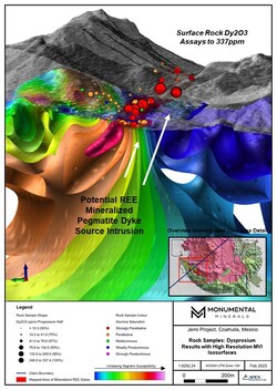VANCOUVER, BC, Feb. 23, 2023 /CNW/ - Monumental Minerals Corp. ("Monumental" or the "Company") (TSXV: MNRL) (FSE: BE5) (OTCQB: MNMRF) is pleased to provide an update on exploration at the Jemi rare earth element (REE) project (the "Project") located in Coahuila, Mexico, about 40 km south of the Texas, USA border. Rock sampling across a broad area has discovered high grades of the critical magnet metals dysprosium (Dy) and terbium (Tb) and defined a series of high priority drill targets.