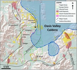 Figure 1 – Beatty District shaded relief map showing major gold deposits and areas of steam heated alteration in relation to major structures. A strong zone of alteration occurs north of Zacapa’s claims and appears to continue south under cover toward the Longtail target area. The Longtail mercury in soil anomaly is also displayed illustrating areas with values more than three standard deviations above mean. The locations of faults are approximate or inferred, especially where under cover. The Oasis Valley caldera boundary is modified from Coolbaugh et al., 2020(14). Deposit shapes reflect approximate areas of disturbance and should not be interpreted to indicate the size or shape of the orebody. (CNW Group/Zacapa Resources)