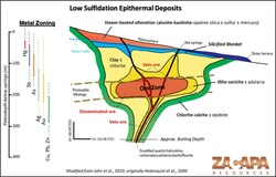 The upcoming South Bullfrog drill program will test below what is interpreted as the shallow expression of alteration in a low-sulfidation epithermal system (Figure 2). In these types of systems, hot metal-bearing water migrates up faults and fractures in a hot spring type setting, similar to modern day Yellowstone. As the metalliferous water ascends, the pressure decreases and it begins to boil, which causes metals such as gold and silver to drop out of solution forming gold-bearing quartz-carbonate veins. In some areas, rocks with high permeability will also allow the metalliferous water to migrate laterally away from the fault, forming larger disseminated deposits, often containing disseminated pyrite. The Beatty District displays both styles of mineralization, sometimes within the same deposit (e.g. Silicon). Often, when the hot spring system is fully preserved, as it is at Silicon, the upper "steam-heated" alteration zones contain little if any gold or precious metals13,16. Instead, they are dominated by extensive silicification with alunite and kaolinite alteration, containing elevated concentrations of mercury and lesser antimony and arsenic.