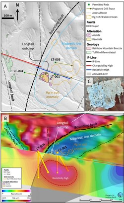Longtail Drill Program At Longtail a 40-metre-wide window through alluvial cover reveals strongly silicified, alunite-kaolinite altered, volcanic rocks with strongly elevated mercury along with traces of arsenic, antimony, and gold (Figure 3). This target sits adjacent to the inferred margin of the Oasis Valley Caldera, and the coincidence of the mercury anomaly with a large magnetic low suggest that there could potentially be a large zone of alteration, up to 1 km strike length, where the steam-heated alteration has destroyed magnetite in the rocks to create the observed magnetic low. Drilling at Longtail will test several interpreted structures as well as the extent of the alteration, with the goal of drilling into the controlling structure at depth where gold mineralization would be expected to occur.