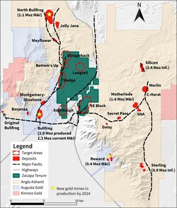 Epithermal Gold Deposits and the Beatty District The Shingleback and Longtail prospects are located in the northern third of the South Bullfrog project, north of Beatty Nevada (Figure 1). These two prospects were discovered through diligent mapping and sampling programs, combined with remote sensing, geophysics, and geochemical surveys. Zacapa's claims in this area are bordered to the west, north, and east by AngloGold Ashanti, which is activity advancing its North Bullfrog and Silicon development projects, while also exploring its Merlin discovery ( AngloGold Ashanti).