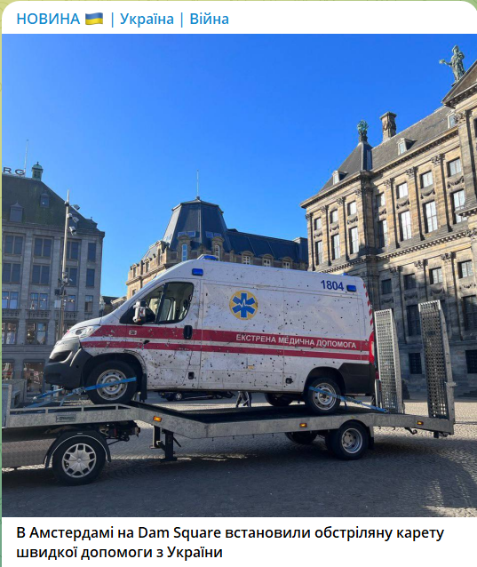 Ukrainian ambulance, shot up by Russian army, being readied for display on Dam Square in Amsterdam, the Netherlands.