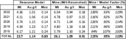 2022 saw a 39% positive ore tonnage and 7% negative grade reconciliation. This is attributed to the complex mineralization styles, additional low-grade mineralization identified through grade control drilling, and lower model confidence based on the challenge in obtaining optimal drilling coverage at Gay Tan open pit where drill rig access is limited. The tonnage and grade reconciliation significantly improves if mined Inferred Resources are considered.