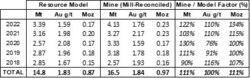 Table 6 summarizes the combined Macraes open pit and underground resource model reconciliations for 2018 to 2022. The resource model to mill-adjusted mine reconciliation for the five years to 2022 shows variable performance from year to year, albeit the long-term average performance for this period has been reasonable; + 15% for tonnes, - 5% for grade and + 10% for contained gold at a 0.5 g/t cut-off.