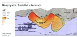 Geophysics: Induced Polarization Background induced polarization observed in the host rock at the Ranger-Wyoming complex and surrounding area in the western end of the Silver Valley is typically between 0 and 4 msec, as compared to the +20 msec background observed in the Prichard formation to the north of the Osburn Fault. The Ranger-Wyoming induced polarization anomaly are locally as high as 10msec, more than twice the observed background polarization of the host rock. The strike length of this anomaly is approximately 1200 metres. The depth is approximately 600 meters. High overlapping resistivity data at the Ranger-Wyoming target is interpreted to be silicic alteration associated with a potential mineralized system. This is a strong indicator of mineralization in the Coeur d'Alene mining district and complements both the induced polarization response in addition to anomalous geochemistry on surface.