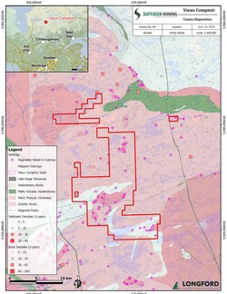 VANCOUVER, BC, April 20, 2023 /CNW/ - Superior Mining International Corp. ("Superior Mining" or the "Company") (TSXV: SUI) (OTC: SUIFF) is pleased to announce that the Company will commence its field exploration program at the Vieux Comptoir Property (the "Property"). The 2-phase program is to include detailed remote sensing, heliborne magnetic survey, and an inaugural field exploration and prospecting work program at the property.