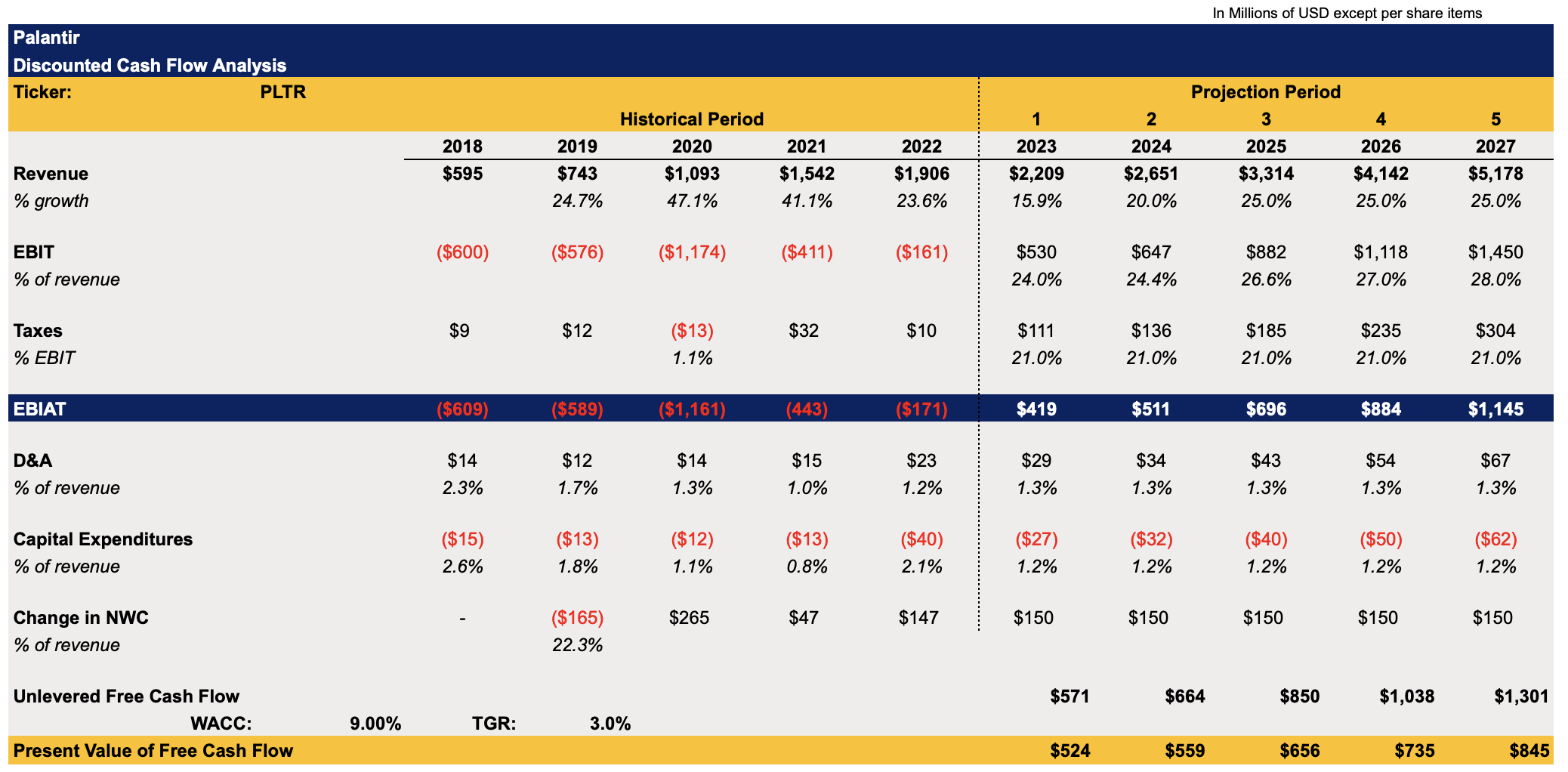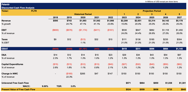 Palantir's DCF Model (Historical Data: Seeking Alpha, Assumptions: Author)