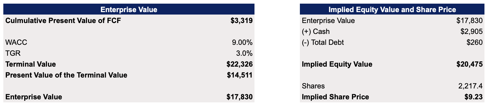 The updated model shows Palantir’s enterprise value to be $17.8 billion while its fair value is $9.23 per share, above the previous estimates but below the current market price.