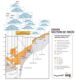 Section 22-5N(2) is the longest drill section released to date by the Company. Running 400m east-west, this section starts at the bottom of the East Ridge Target, completely crosses the Atlanta Mine Fault Zone ("AMFZ") and then transits most of the West Atlanta Graben. The same structural and mineralization patterns are repeated along drill fences for at least 400m northward. Mineralization remains open at both ends of Section 22-5N(2) and the Company will soon initiate drilling to track the mineralization hit in AT22-RC12 and RC13 eastward up into the East Ridge Target and westward from AT22HG-8T later this summer to test mineralization beyond the West Atlanta Graben's western margin.