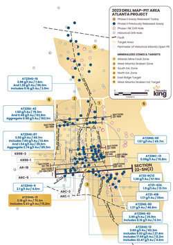 Looking immediately south of Section 22-5N(2) is the east-west trending South Fault, which previous explorers perceived to cut off mineralization at Atlanta. However, holes drilled by Nevada King indicate gold mineralization is in fact present south of the South Fault, which implies that the AMFZ could well extend further south into the South Extension Target. If this area proves to host gold mineralization, a significant area currently categorized as strip material could instead contribute to a future resource, while opening up mineralization further south along the WAF in an area with no historical drilling. Given the strong mineralization seen along Section 22-5N(2) the Company will now target the extension of this high-grade gold southward from this section.Cal Herron, Exploration Manager of Nevada King, commented, "We continue to interserct higher-grade results as our drills step westward across the WAF from the AMFZ into the West Atlanta Graben. The WAF is a major control over gold/silver mineralization and proximity to this structure is the key to finding higher-grades within the adjacent AMFZ and West Atlanta Graben. The Company will continue drilling more fences east-west across the WAF in order to expand the northerly-trending high-grade core zone and test the thick, volcanic-hosted mineralization occurring within the adjacent West Atlanta Graben. The Company will also test for mineralization southward along the AMFZ, moving into an area with no historical drilling that is looking more like a major blue sky target at Atlanta."