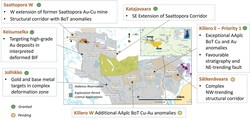 Figure 1. Locations of the five granted exploration permits (Saattopora W, Keisunselka, Jolhikko, Katajavaara, and Killero E) within the Northern Finland Gold-Copper Project.