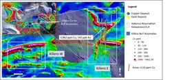 Figure 2. Killero E target areas as defined by combined geochemical (BoT) and geophysical (drone magnetic survey data) anomalies. (CNW Group/Capella Minerals Limited)