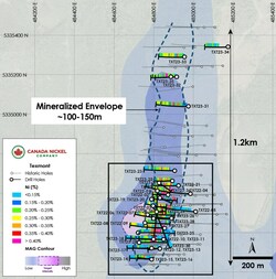 Mark Selby, CEO of Canada Nickel, said, "This latest set of assay results reinforce our thesis of near-surface high-grade intervals within thick mineralized sections which support the potential for near-term, smaller scale, open pit production. We look forward to delivering an initial resource and Preliminary Economic Analysis ("PEA") on Texmont this year as its near-term production potential is highly complementary to our large-scale Crawford and regional nickel sulphide project potential."