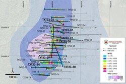 Assay results from final 11 drillholes confirm continued high-grade near-surface mineralization within thick mineralized sectionsSeven of 11 holes intersected nickel grades > 1% and all 11 holes intersected nickel grades >0.5%Hole TXT23-39 intersected 3.0 metres of 2.31% nickel within 15.0 metres of 0.83% nickel within 90.0 metres of 0.34% nickel starting at 12 metresHole TXT23-36 intersected 3.0 metres of 2.34% nickel within 12.0 metres of 1.06% nickel within 96.5 metres of 0.36% nickel starting at 4.5 metres