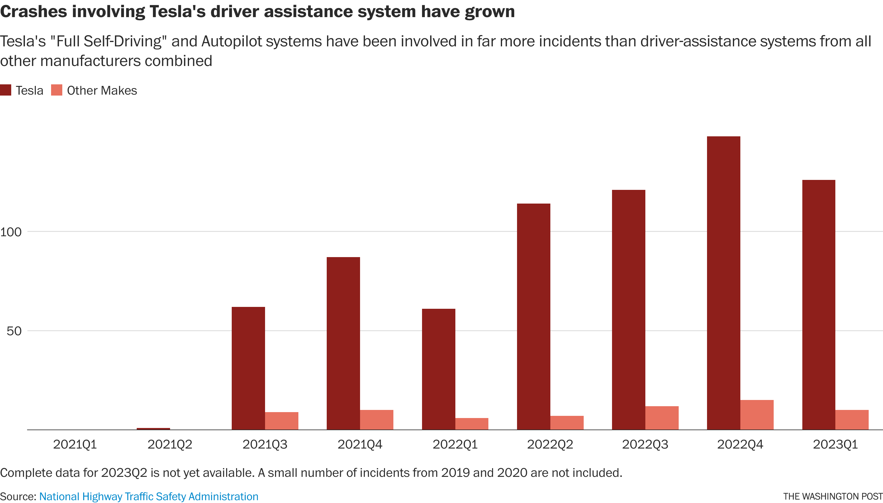 The crash in North Carolina’s Halifax County, where a futuristic technology came barreling down a rural highway with devastating consequences, was one of 736 U.S. crashes since 2019 involving Teslas in Autopilot mode — far more than previously reported, according to a Washington Post analysis of National Highway Traffic Safety Administration data. The number of such crashes has surged over the past four years, the data shows, reflecting the hazards associated with increasingly widespread use of Tesla’s futuristic driver-assistance technology as well as the growing presence of the cars on the nation’s roadways.