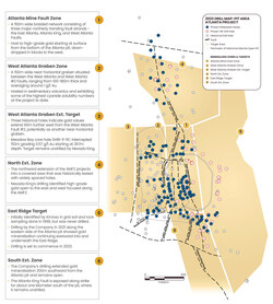 The Company is currently utilizing one rig to define deeper mineralization within the West Atlanta Graben, while a second rig is targeting shallower mineralization along the Atlanta Mine Fault Zone ("AMFZ"), both in the pit and connecting into the North Extension Target. A third rig is active on the East Ridge Target, testing a highly prospective, never before drilled, large area (1,200m x 150m) directly adjacent to the resource zone (see Figure 1).