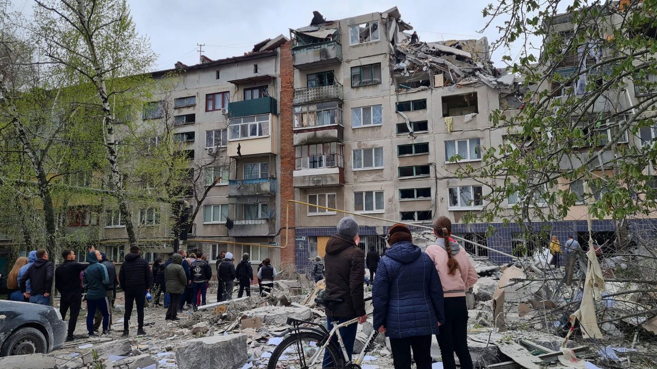 Local residents stand next to an apartment building damaged by a Russian military strike in Sloviansk, eastern Ukraine on April 14, 2023. Press service of the Donetsk Regional Military-Civil Administration/Handout/Reuters