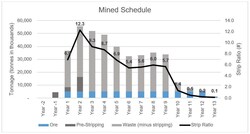 FIGURE 2: LOM Profile for the Mined Schedule Showing Tonnage Moved and the Accompanying Strip Ratio. (CNW Group/GoldMining Inc.)
