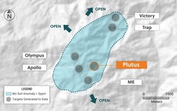 To date, Plutus covers 1,000 metres by 720 metres in area and hosts multiple mineralization styles including porphyry veining, porphyry related breccia mineralization and late-stage carbonate base metal ('CBM") veins.