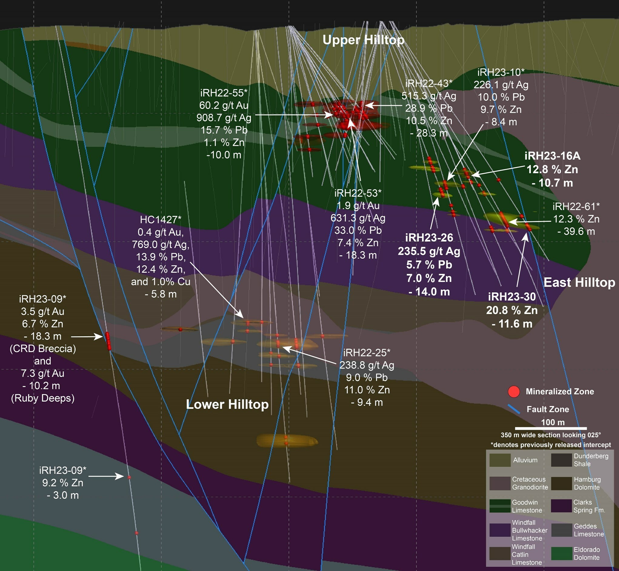• East Hilltop CRD – Early in the 2023 drill program, high-grade CRD mineralization was discovered to the east of the Upper Hilltop Zone and proximal to the East Hilltop Skarn Zone with an intercept of 9.7 % Zn, 10.0 % Pb and 226.1 g/t Ag over 8.4 m in hole iRH23-10 (see press release dated April 25, 2023 and Figure 1). New hole iRH23-26 was drilled to follow-up the initial discovery, returning high-grade mineralization, and ongoing drilling continues to expand CRD mineralization at East Hilltop with assays pending. Hole iRH23-26 intersected multiple zones of mineralization including:
