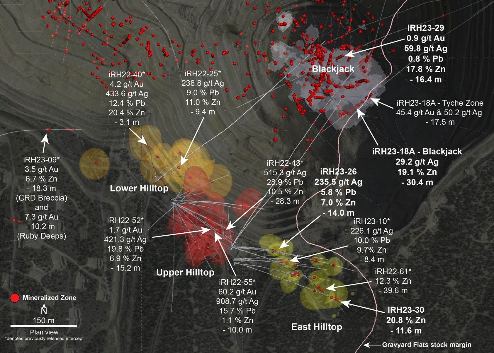 In mid-2022, the Upper Hilltop Zone was discovered with an intercept of 515.3 g/t Ag, 28.9 % Pb, 10.5 % Zn and 0.9 g/t Au over 28.3 m in hole iRH22-43 (see press release dated August 30, 2022). This led to the definition of multiple polymetallic CRD and skarn zones to the south of the Blackjack deposit, on the south side of the Archimedes pit, situated along the Hilltop fault structure. Mineralization has now been defined over a strike length of approximately 750 metres including the Upper, Lower and East Hilltop Zones (see Figures 1 & 2). Current drilling is focused on the Blackjack and East Hilltop Zones until new drill set-ups are constructed for delineation and expansion drilling and to resume definition of the Upper Hilltop Zone.