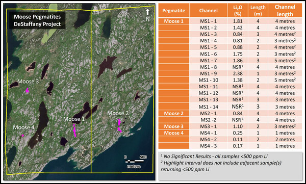 Results have been received for 68 rock sawn channel samples collected from 20 channels testing four pegmatites.Significant lithium mineralization has been returned from 9 of 14 channels (54 samples) testing a 260m strike extent of the Moose 1 pegmatite, including 1.81% Li2O over 4m and 1.42% Li2O over 4m from channels MS1-1 and MS1-2, respectively.0.84% Li2O over 4m was returned from Channel MS2-1 in an area of the Moose 2 pegmatite previously mapped as lacking lithium (spodumene) mineralization.The Moose 3 pegmatite returned 1.10% Li2O over 2m, supporting observations of abundant spodumene mineralization at this newly discovered locality.Location and length of individual channels was restricted to available outcrop exposures and do not reflect the full width of each pegmatite. Moose 1 and Moose 2 range up to 11m and over 30m in width, respectively.