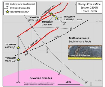 Figure 2. Section 2500N through the Storeys Creek historical underground developments showing the locations of select core samples with associated Li2O values. (CNW Group/TinOne Resources Corp.)