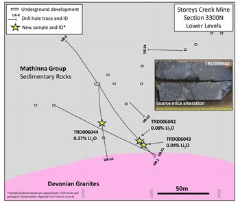 Storeys Creek – Three of the highest lithium results were from samples of sedimentary rocks representing the host lithologies to the prospective tin-tungsten bearing Devonian granites. Sample TRD006031 from hole U9-38 returned 0.47% Li2O (2,190 ppm Li) of a mica-rich altered sandstone cut by discrete quartz veins. This sample was collected approximately 100 m above the deeper granite (Figure 2). Sample TRD006044 from hole U8-1A returned 0.27% Li2O (1,275 ppm Li) collected from a sandstone cut by mica-rich veins with associated quartz and sphalerite (zinc sulfide). This sample was collected approximately 50 m above the granite (Figure 3).