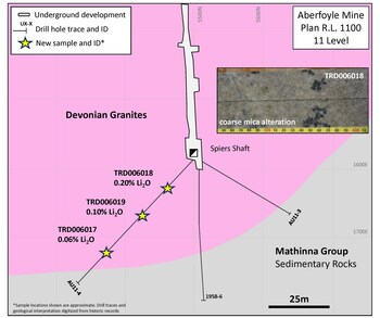 Definition of a new style of lithium mineralization at Aberfoyle:Select drill core samples of mica-rich sedimentary rocks, host to the prospective Devonian granites, returned up to 0.47% Li2O at the Storeys Creek target area.Strong lithium mineralization, hosted in sedimentary rocks at Storeys Creek, enhances the prospectivity criteria for lithium beyond Devonian aged granites.Follow-up surface sampling, geological mapping, mineralogical studies and potential drilling, in addition to further sampling of historical drill core, are warranted to fully constrain the lithium potential of the target area.Expanded exploration search space: These new results significantly expand the exploration search-space for lithium mineralization at Aberfoyle and elsewhere across the Company's portfolio of tin-tungsten-lithium projects in northeast Tasmania.Emerging lithium district: the Company holds a dominant ground position over many prospective lithium-hosting granites in northeast Tasmania.