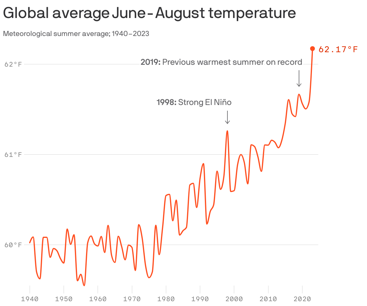 | World's hottest summer |  Data: ECMWF/ERA5 via Brian Brettschneider. Chart: Axios Visuals The first of many batches of last month's temperature data is in, and it's official: